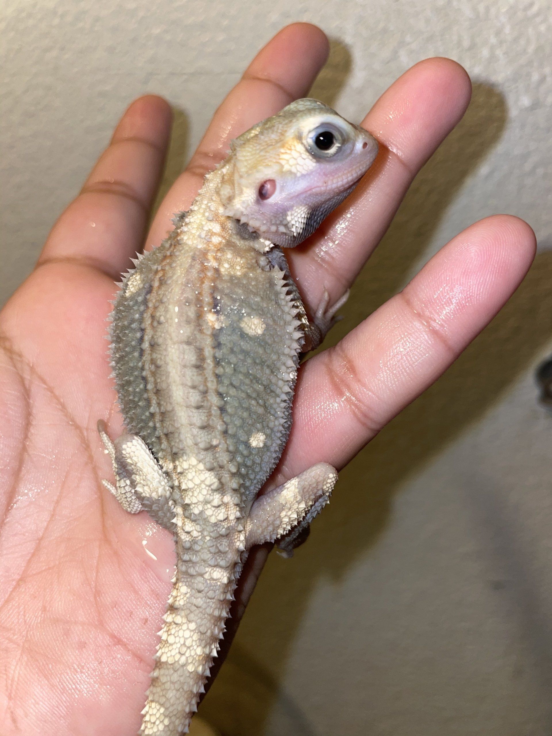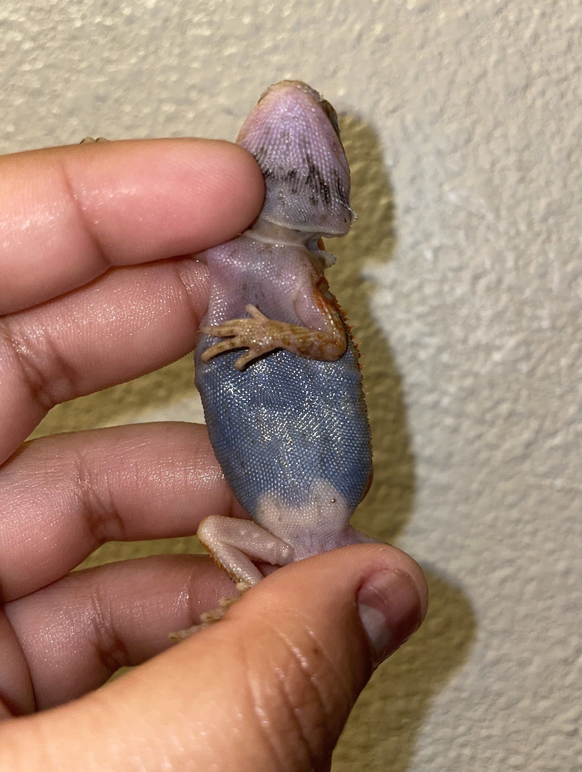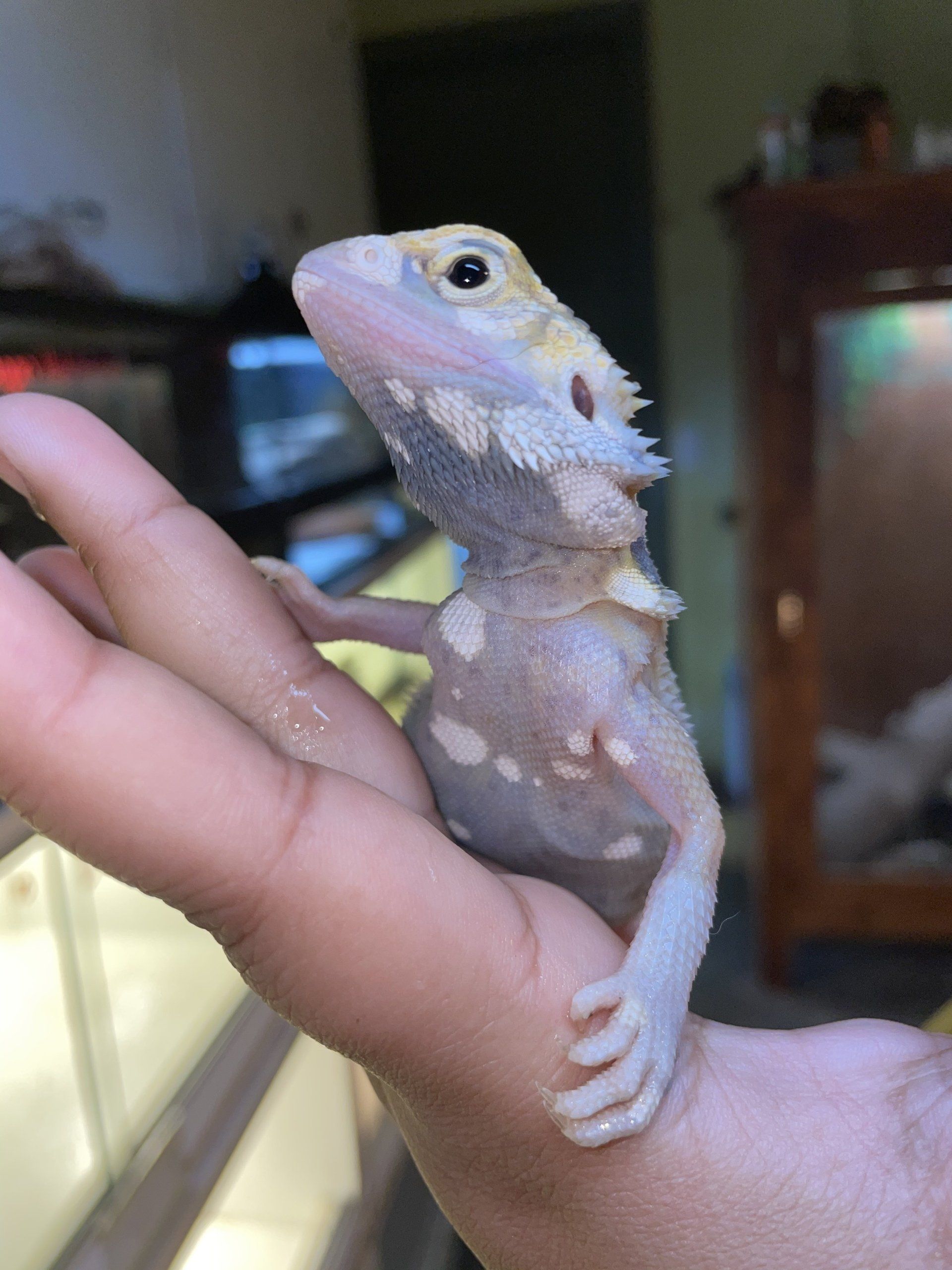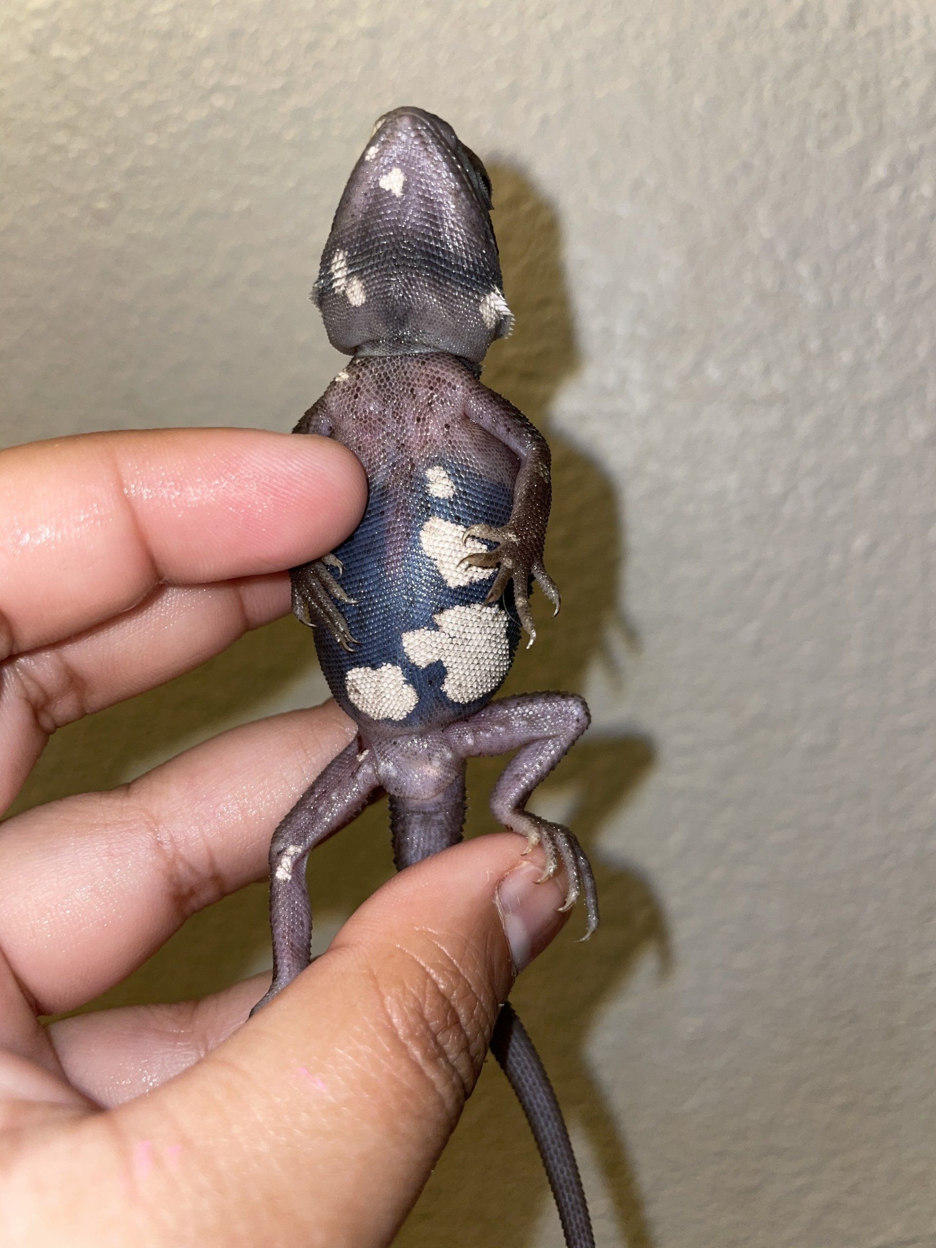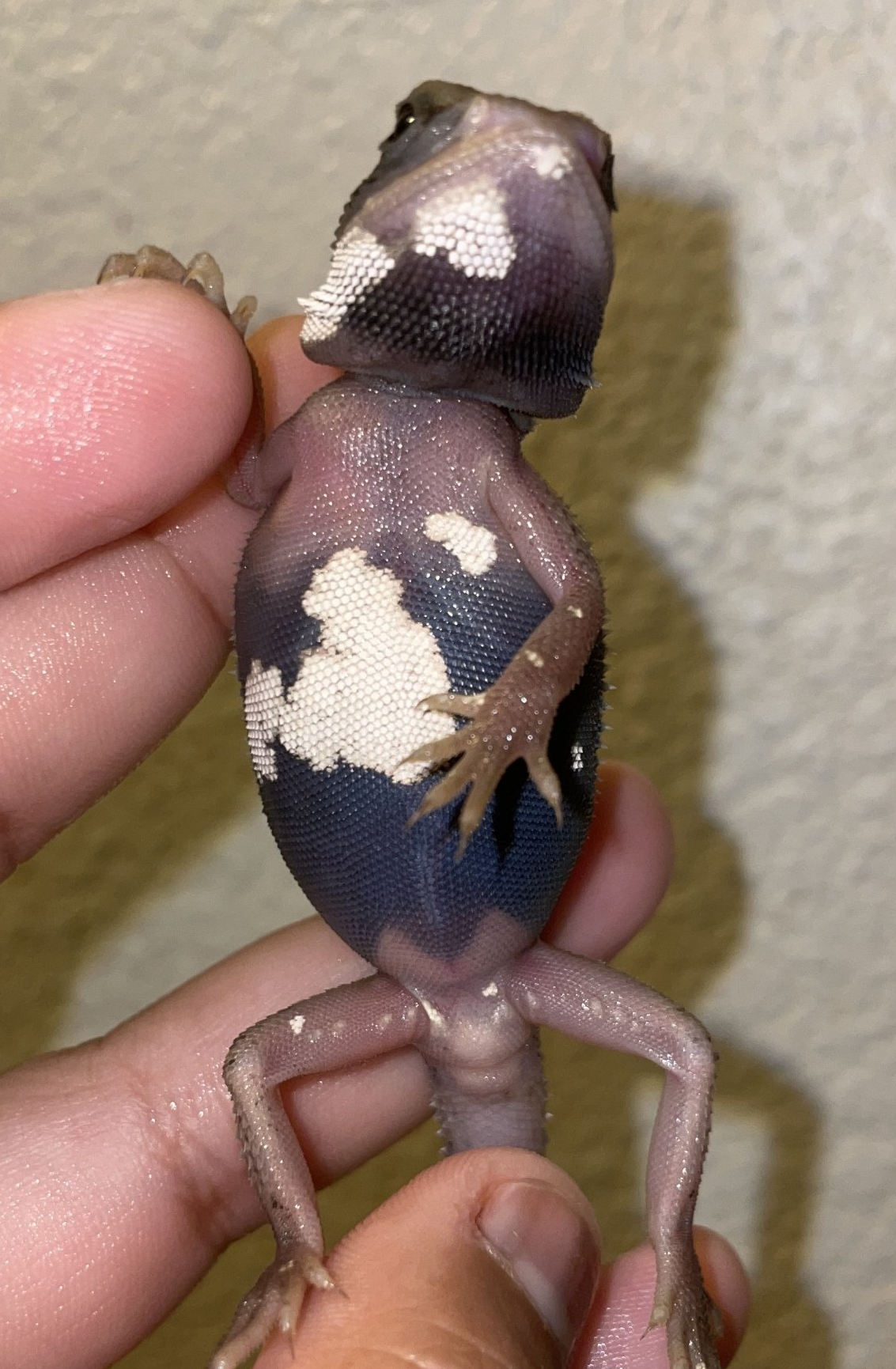 As babies, KC Paradigms are typically born very dark and colorless so their patches create a very high contrast, unique look that can be confused for piebaldism. The only reason the spots on their bellies & beards look white is because that is the color of a ‘normal’ bearded dragon belly. So you’re looking at bright white/off-white ‘normal’ scales poking out through an iconic blue translucent belly.