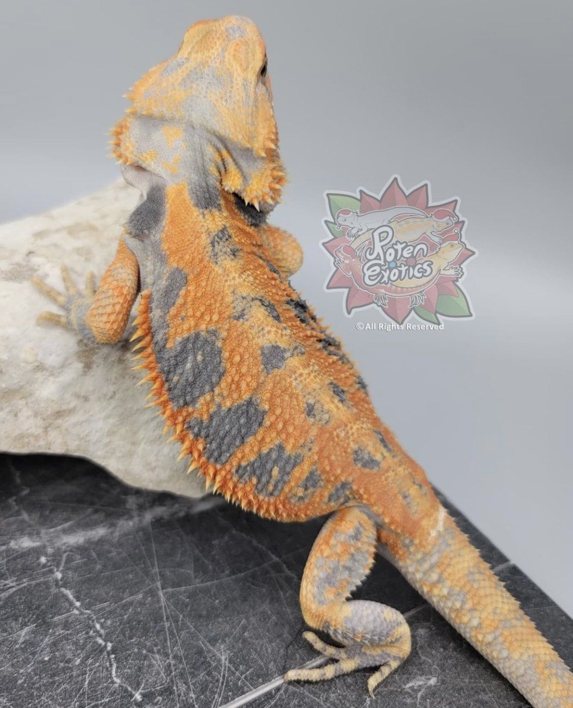 By studying how these babies look when they hatch, how they develop into adulthood, and discussing our findings with many experienced breeders, we have been able to deduct that these babies are displaying an Incomplete Expression of the Translucent gene. The ‘patches’ of colored and discolored scales are not translucent like the rest of the body, they are normal scales. This mixture of normal and translucent scales creates a unique high contrast look in babies. As these guys age, the high contrast typically lessens & the mutation goes on to affect the color and pattern that these dragons display.