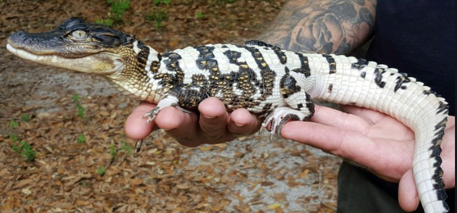 note how the original base color of the lizard remains intact but the patches throughout its head, legs, & tail are paper white. even the eyes in this particular animal are completely white because no pigment is able to be produced there